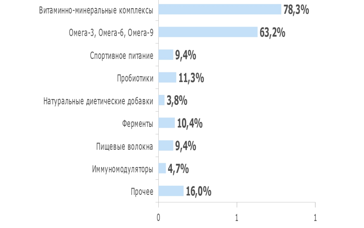 Также востребованными биологически активными веществами являются группа «Омега-3, Омега-6, Омега-9», поддерживающие здоровье суставов, костей, кожи и волос. Так 63,2% респондентов сообщили, что в настоящее время употребляют жирные кислоты в своем рационе.