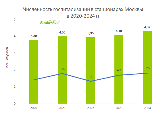 По данным «Анализа рынка стационарных медицинских услуг в Москве», подготовленного BusinesStat в 2025 г, в 2020-2024 гг численность госпитализаций в стационары города увеличилась с 3,8 до 4,3 млн случаев. В среднем за 5 лет доля госсектора составила 84% объема рынка стационарных медуслуг. Рост рынка поддерживается за счет активного строительства и модернизации столичных объектов здравоохранения.