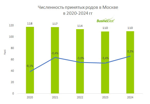 По данным «Анализа рынка гинекологии и акушерства в Москве», подготовленного BusinesStat в 2025 г, в 2020-2024 гг число принятых родов в Москве снизилось на 6%: со 118 до 110 тыс. Основные факторы, оказывающие влияние на число родов: численность населения репродуктивного возраста, уровень доходов, социокультурные и демографические установки, меры государственной поддержки увеличения рождаемости.