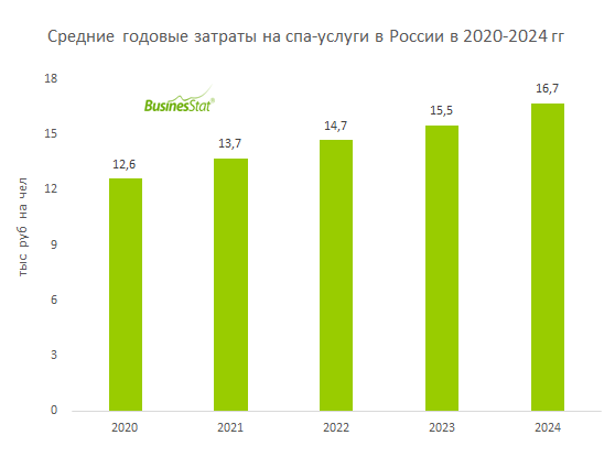 По данным «Анализа рынка спа-услуг в России», подготовленного BusinesStat в 2025 г, в 2020-2024 гг средние затраты россиян на спа-услуги увеличились с 13 до 17 тыс руб на человека в год.