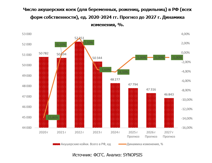 За пятилетний период, с 2020 по 2024 гг, общее число акушерских коек сократилось на 2505 ед., или на 4,9%.