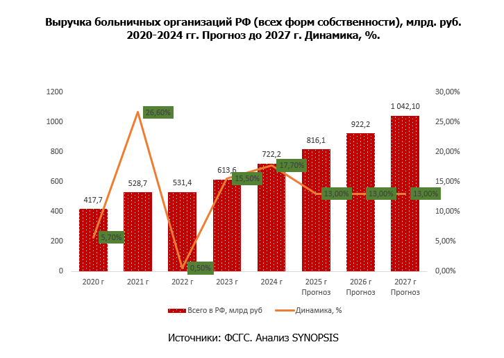По данным Бизнес-плана Хирургической клиники, разработанного SYNOPSIS, в 2024 г выручка от продажи услуг больничных организаций (всех форм собственности) составила 722,2 млрд руб., что на 17,7 % больше, чем годом ранее.